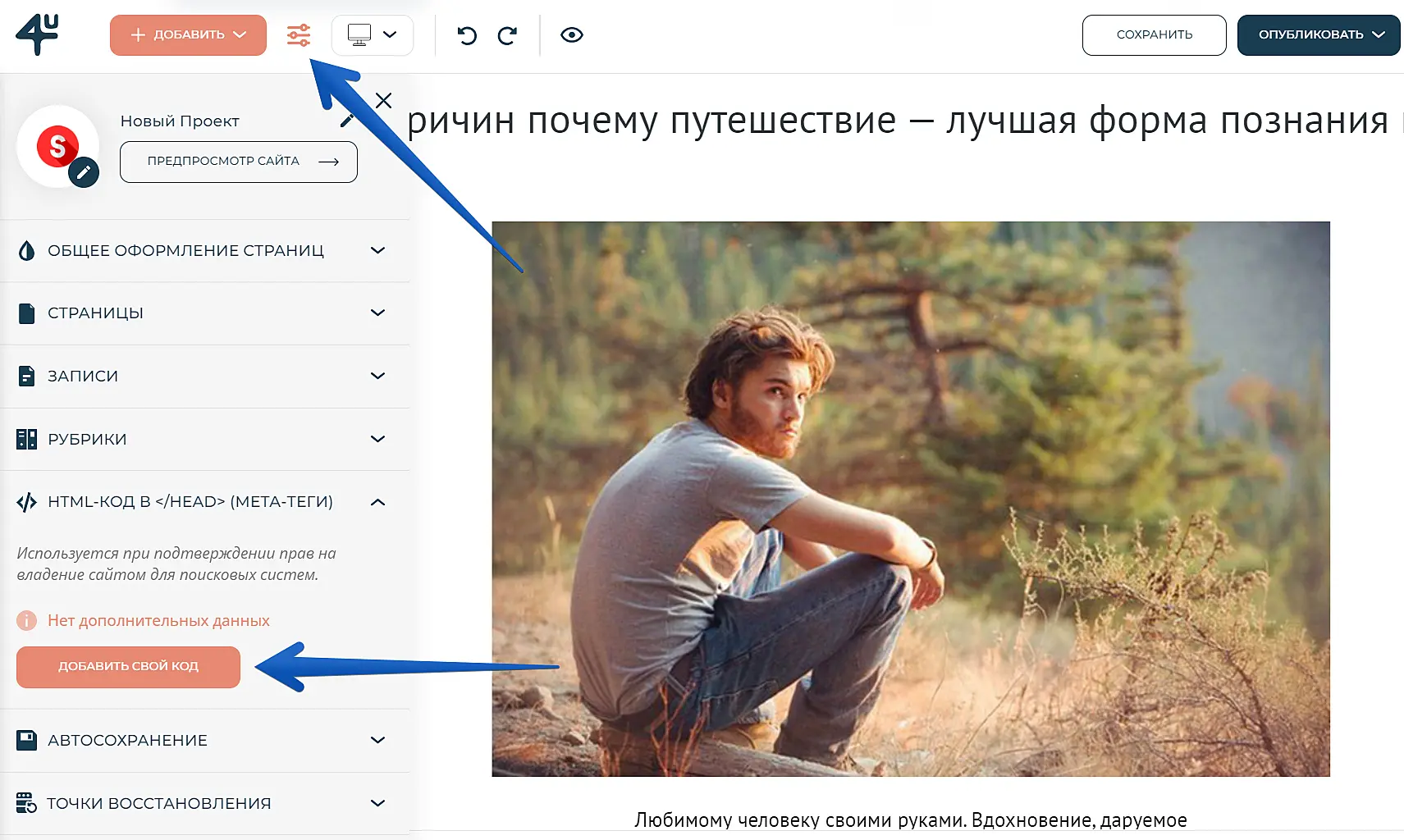 В панели "Управление сайтом" выберите строку "<HTML-код> в < / head> (мета-теги)" и нажмите "Добавить свой код".