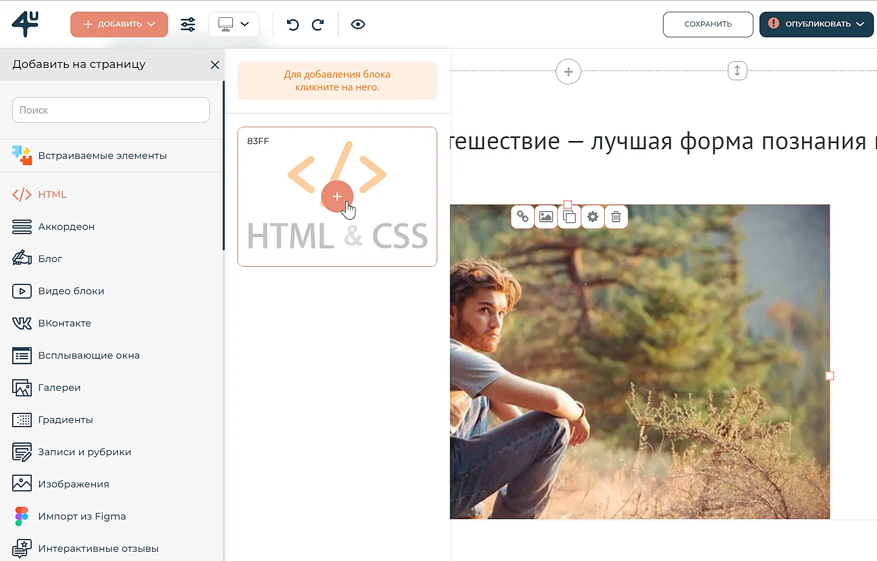 На сайте Fo.Ru зайдите в раздел "Мои сайты". Нажмите "Редактировать" > "Добавить" > "Добавить на страницу" > "HTML" > "HTML & CSS"