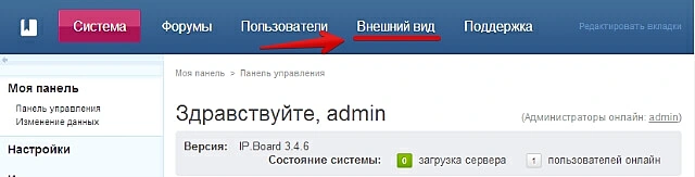 Необходимо зайти в админ центр вашего форума и проследовать к вкладке «Внешний вид».