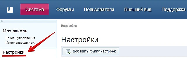 В админ центре вашего форума выберите вкладку «Настройки» в левом вертикальном меню.