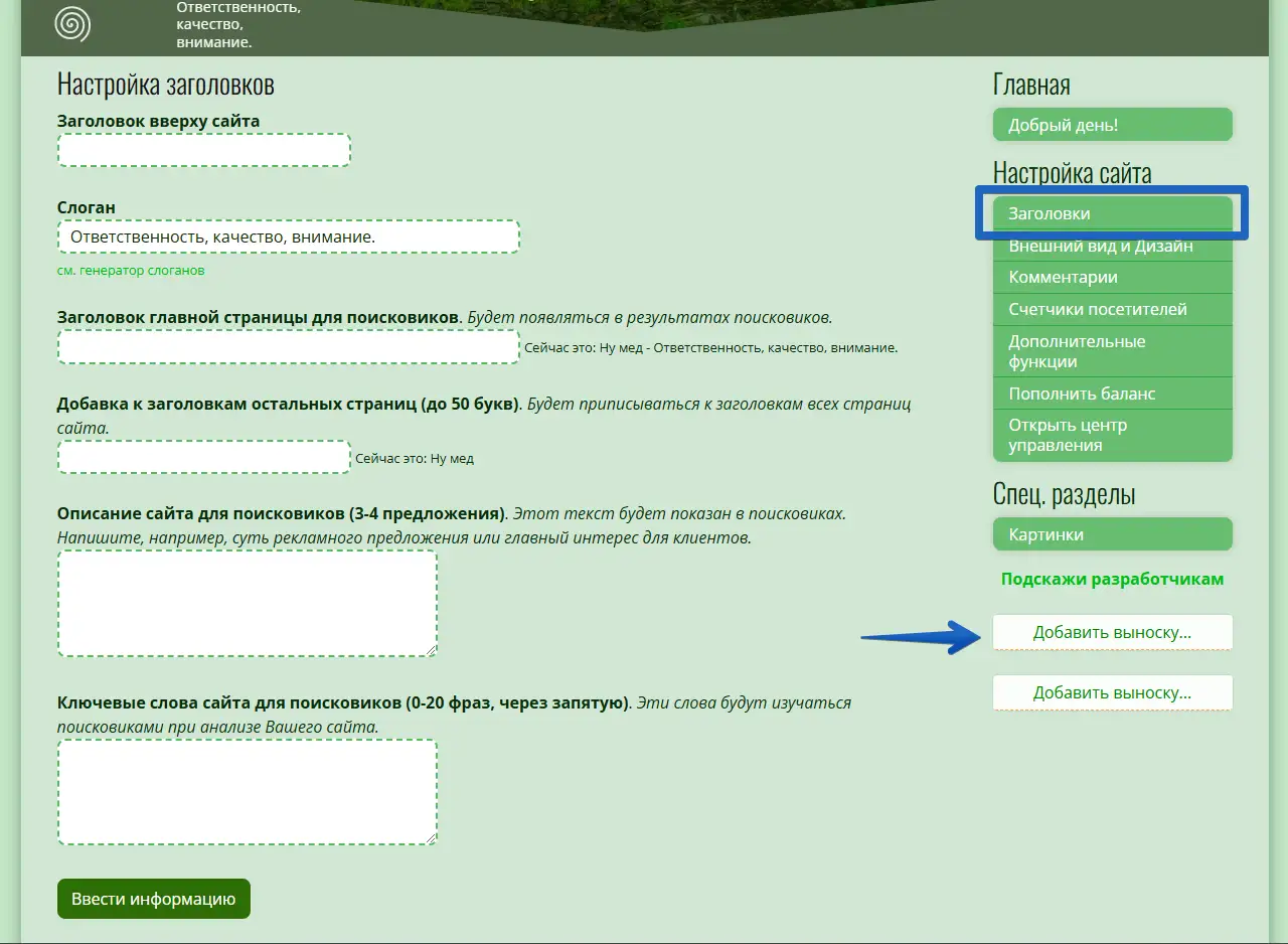 Перейдите в настройки сайта на lact.ru. Выберите "Заголовки".