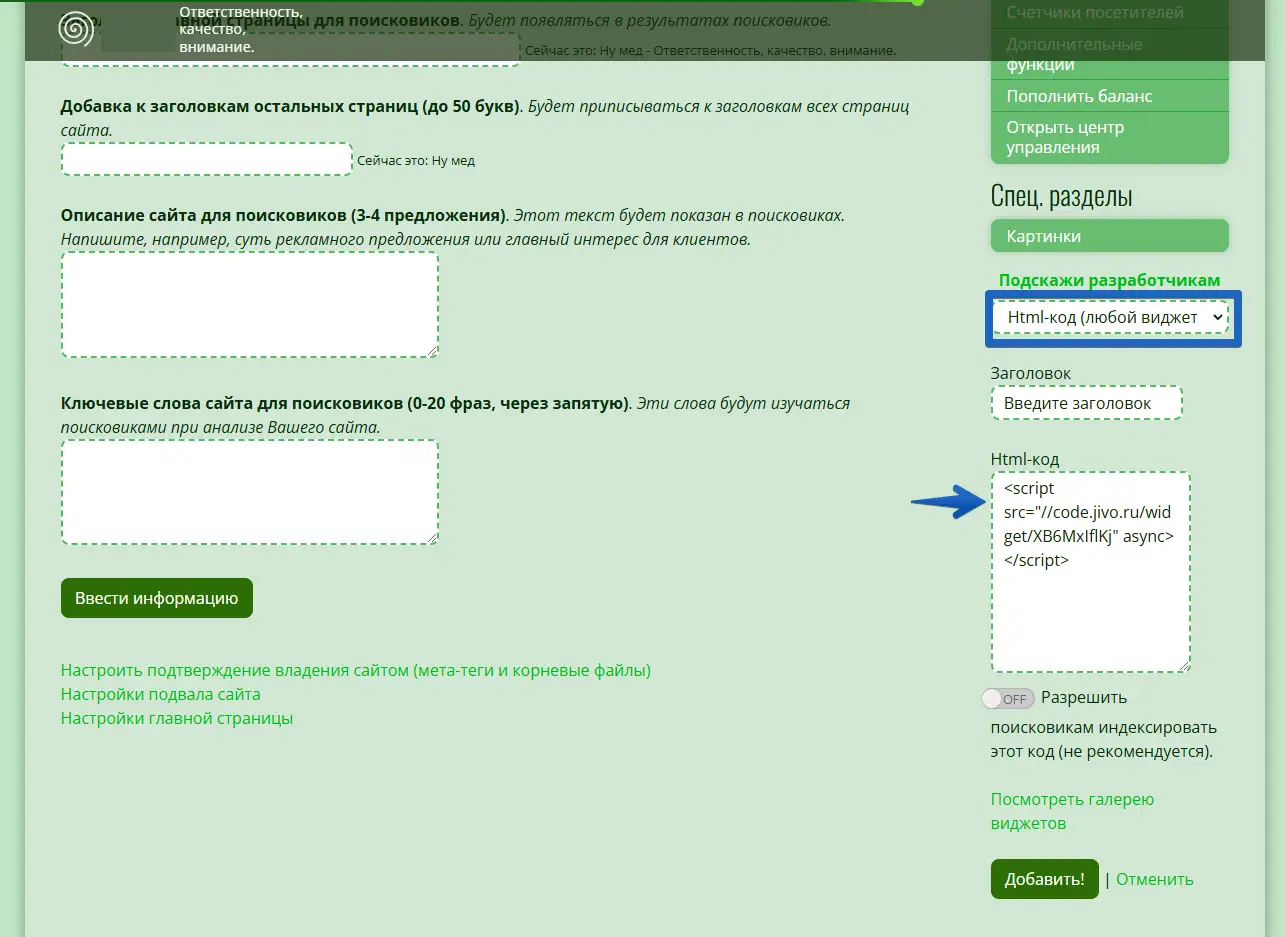 В перечне типов найдите "Html-код (любой виджет)" и вставьте скопированный код виджета Jivo в раздел "Html-код".