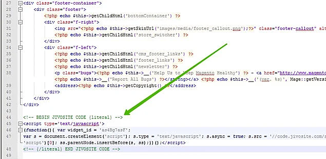 Откройте файл footer.phtml на редактирование в текстовом редакторе и вставьте код чата в самый конец кода файла и сохраните изменения в файле:
