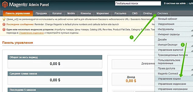 Далее, в панели управления Magento откройте раздел «Система» и выберите раздел «Управление кэшем»: