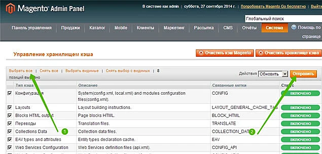 На открывшейся странице, выделите все типы кэша, с помощью кнопки «Выбрать все» и нажмите «Отправить»: