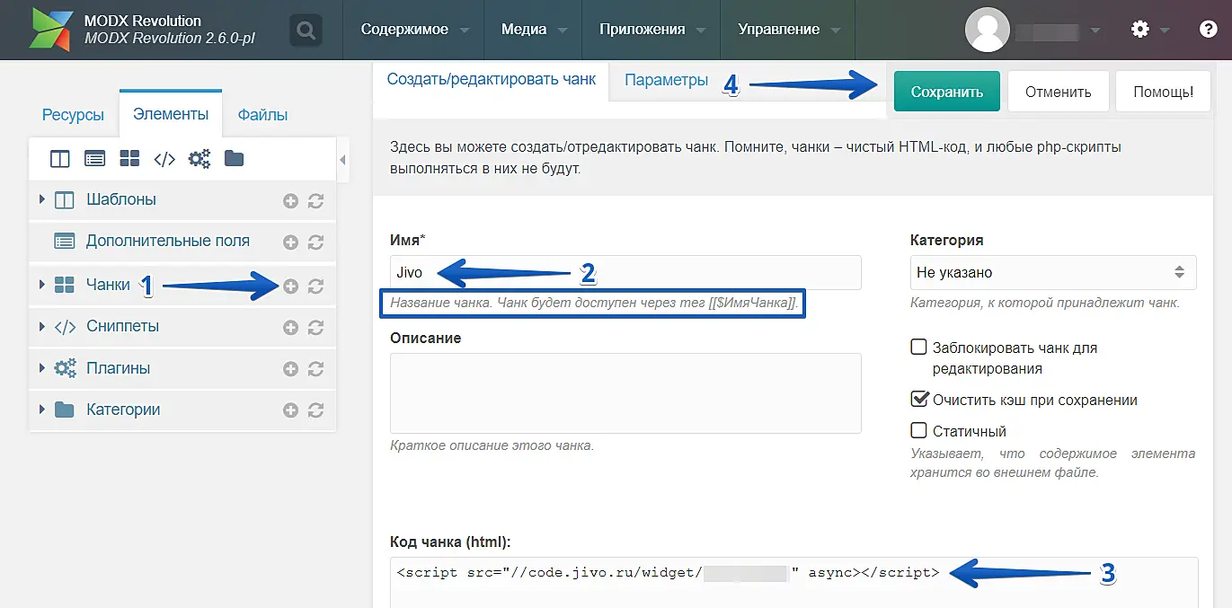 Важно: тег вызова Чанка может быть разным, это зависит от версии MODx. Здесь чанк будет доступен через тег [[$ИмяЧанка]], мы используем Jivo в качестве имени Чанка, поэтому через тег [[$Jivo]].
