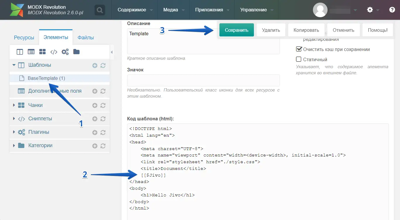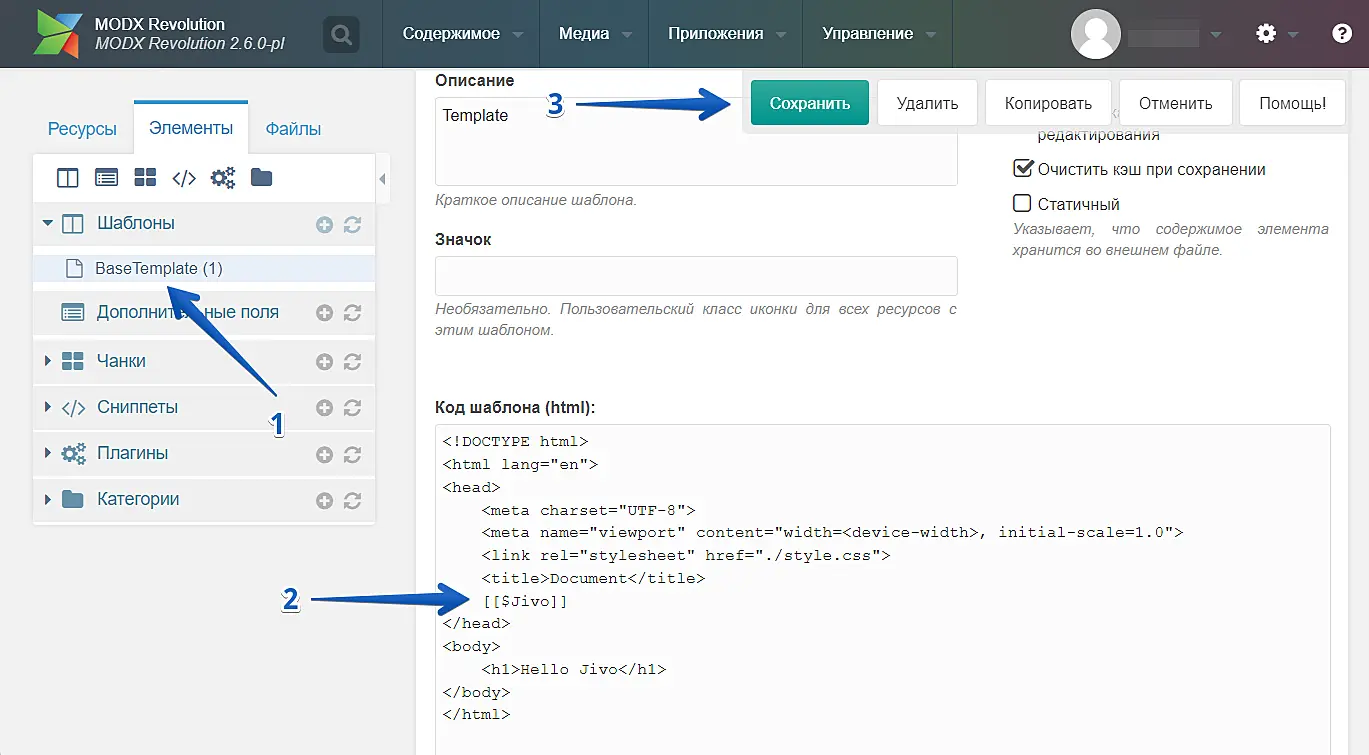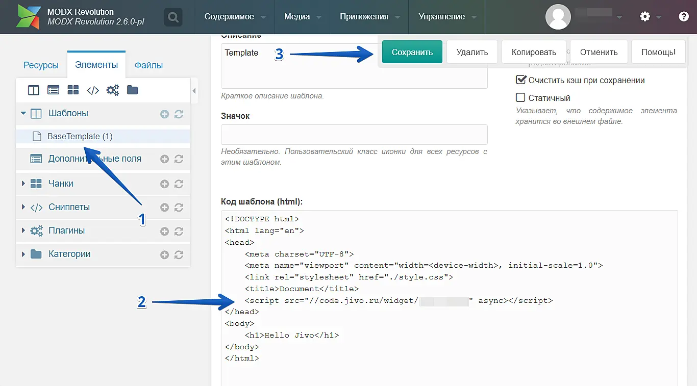 В поле "Код шаблона (html)" перед тегом </ head> вставьте тег Чанка, то есть [[$Jivo]], нажмите "Сохранить".