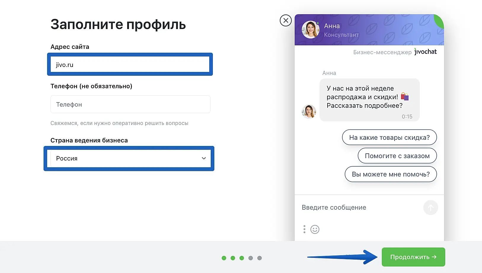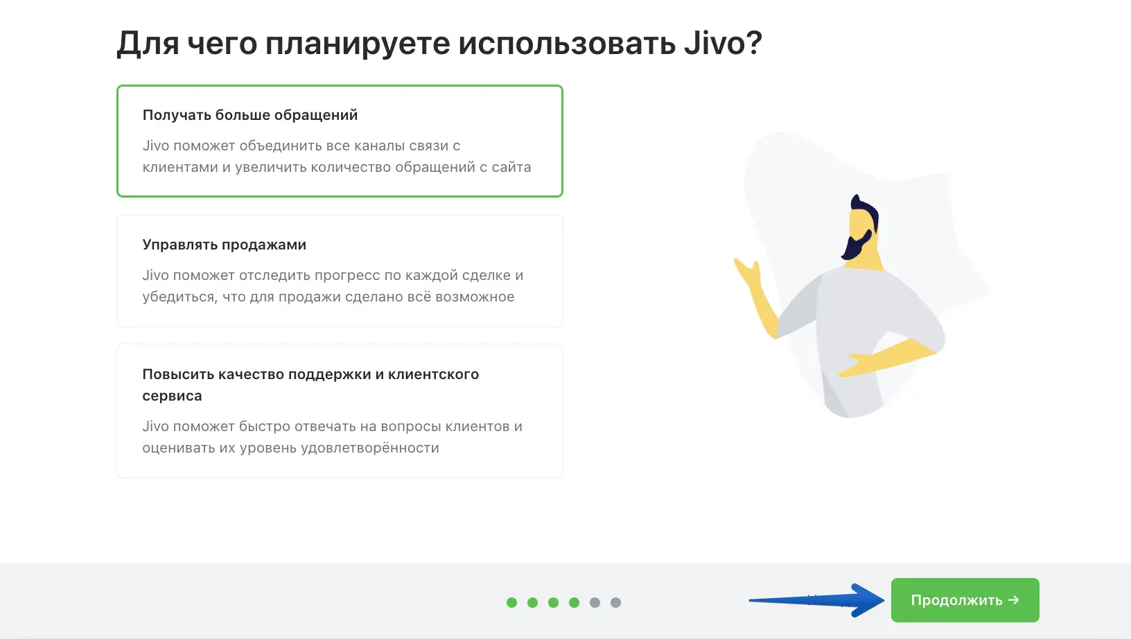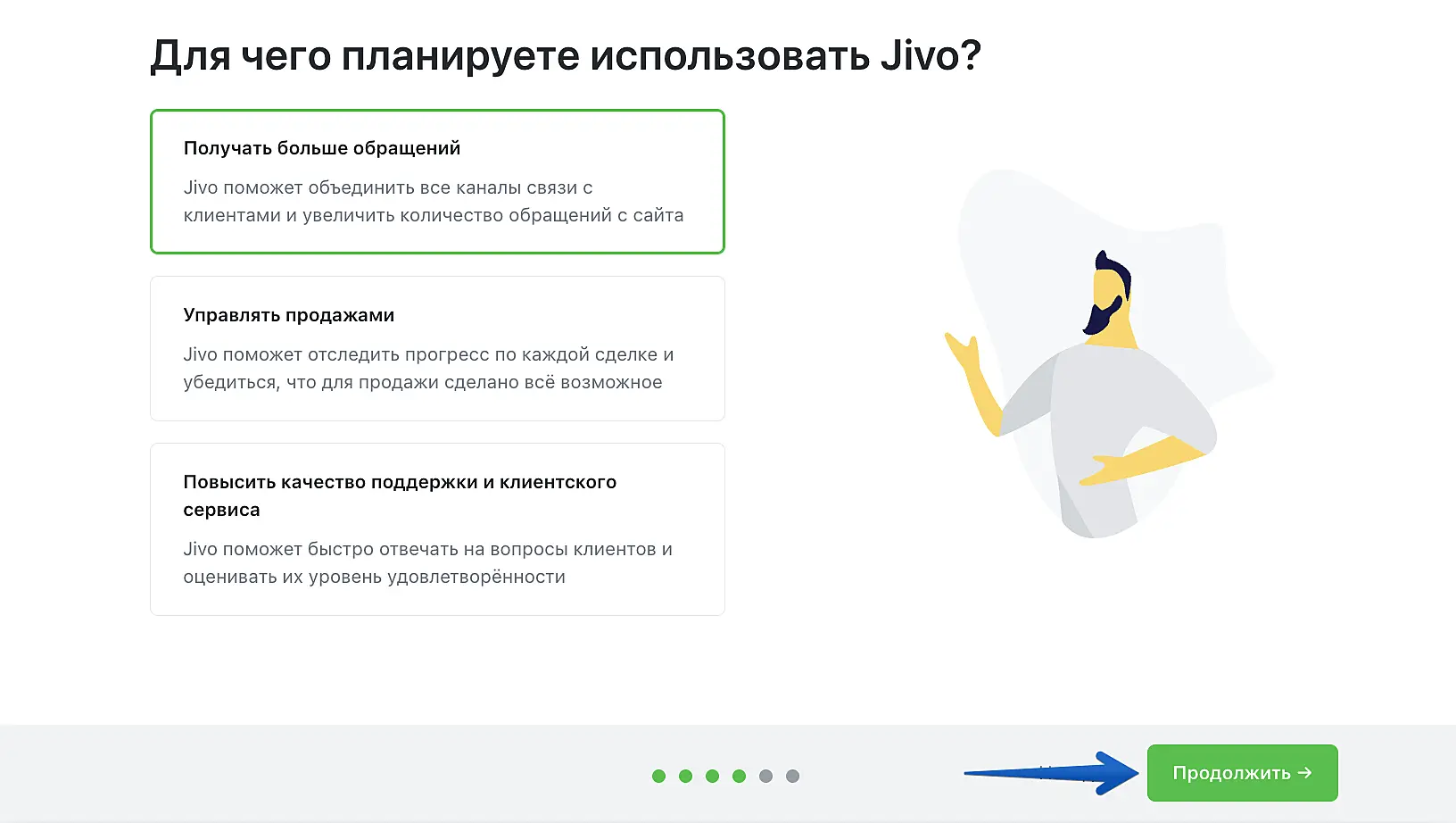 Поделитесь с нами, для каких целей планируете использовать Jivo. Это поможет нам лучше вас понимать и совершенствоваться.