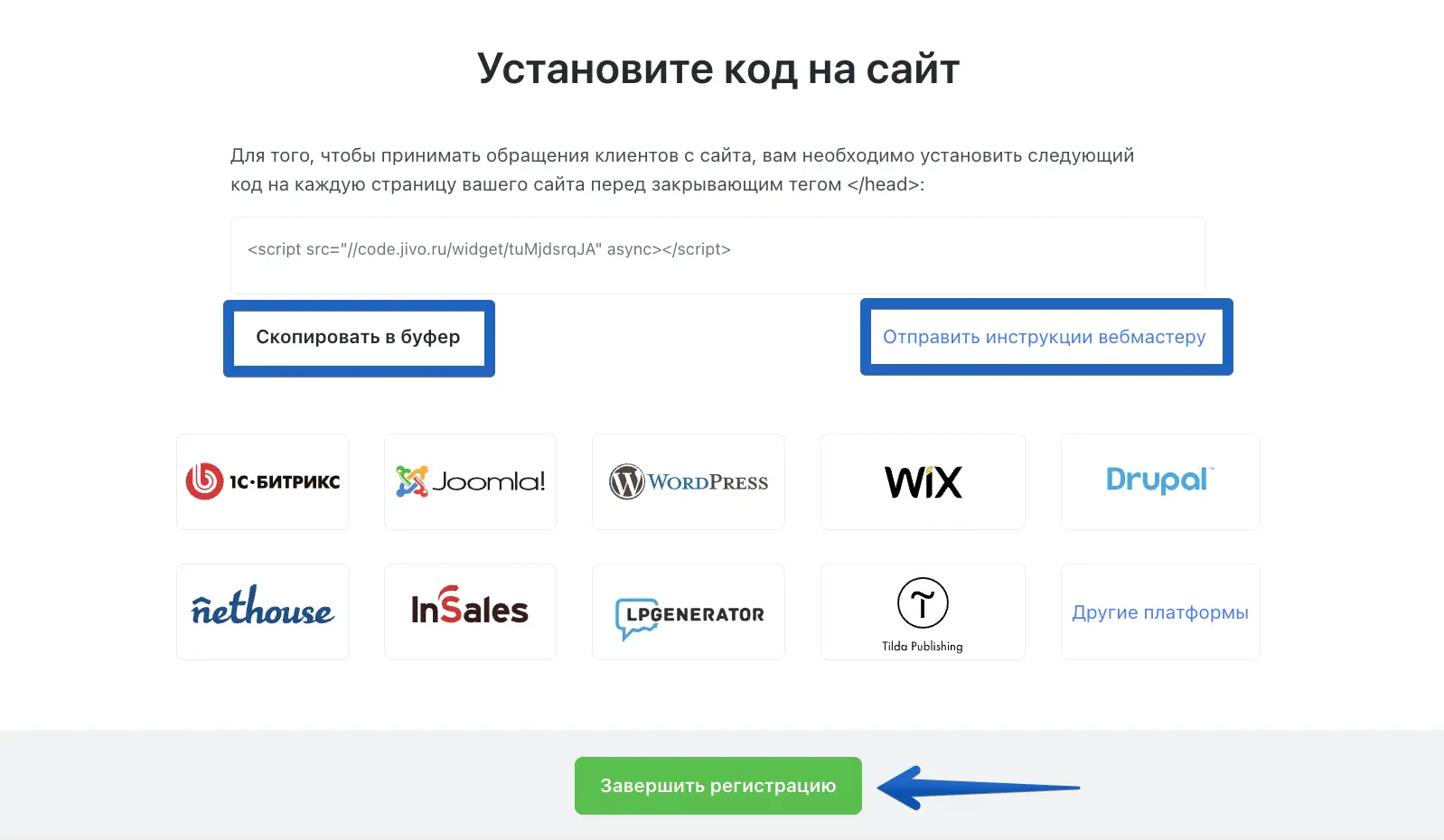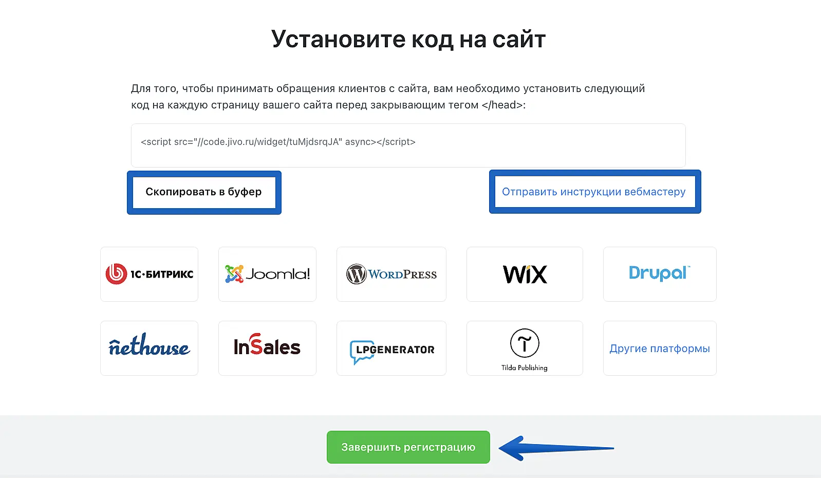 Выполните последний, самый важный шаг — установите код в шаблон вашего сайта, чтобы на нем появился чат.