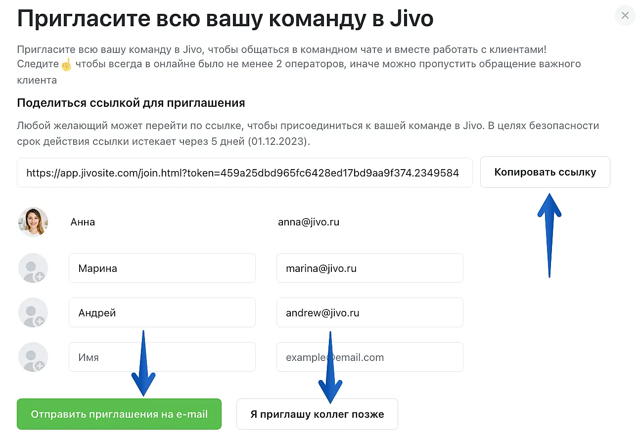 Откроется веб-версия приложения Jivo. Теперь вы можете пригласить коллег — ввести их данные вручную или отправить им ссылку для регистрации.