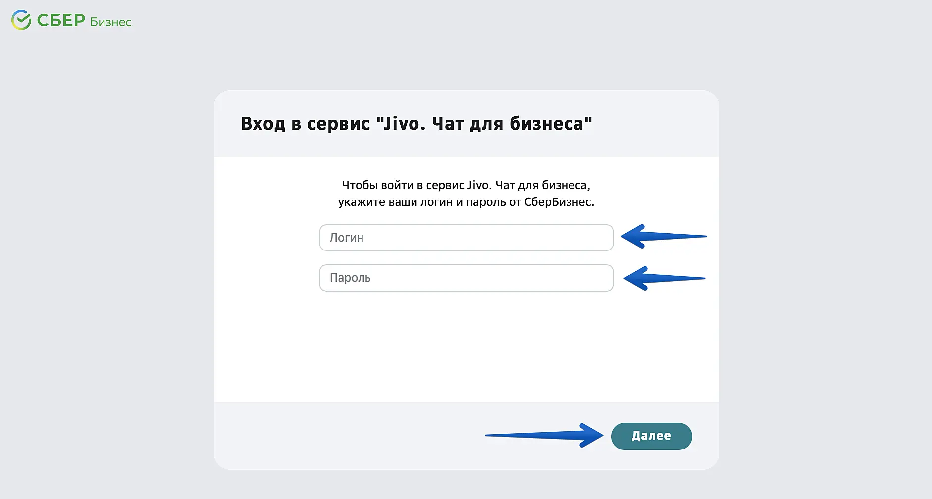 Введите логин и пароль от вашего аккаунта СберБизнес.