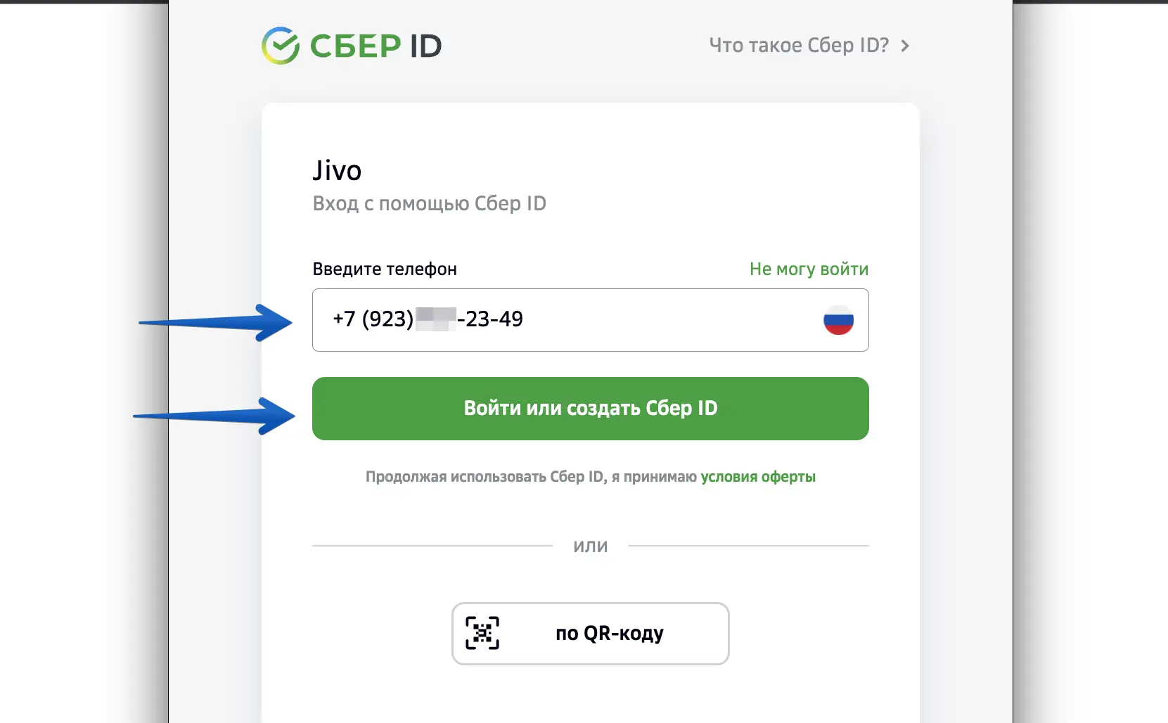 Введите ваш номер и нажмите "Войти или создать Сбер ID".