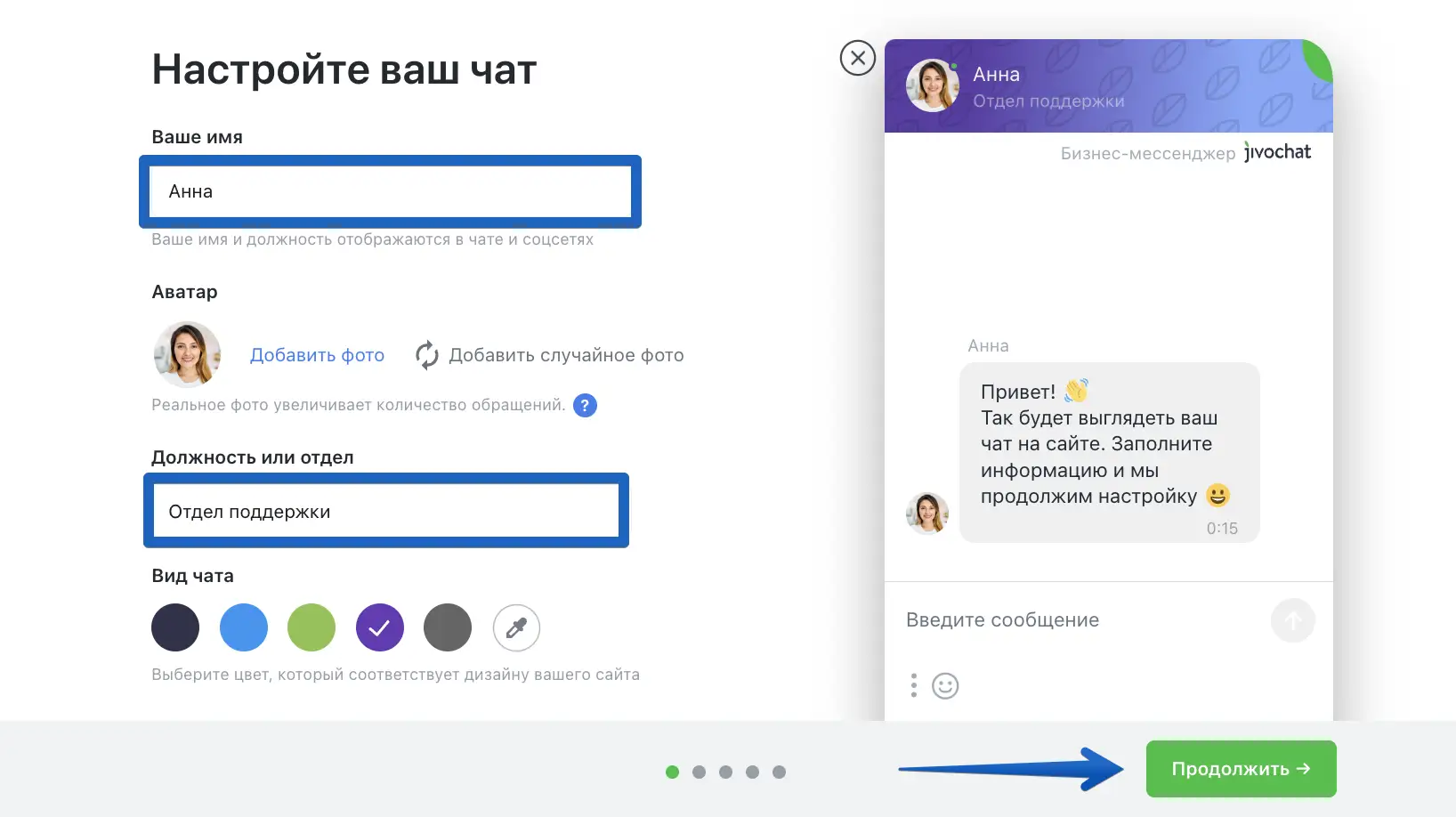 По желанию заполните должность, добавьте ваше фото и выберите цвет виджета — всё это можно будет сделать позднее.
