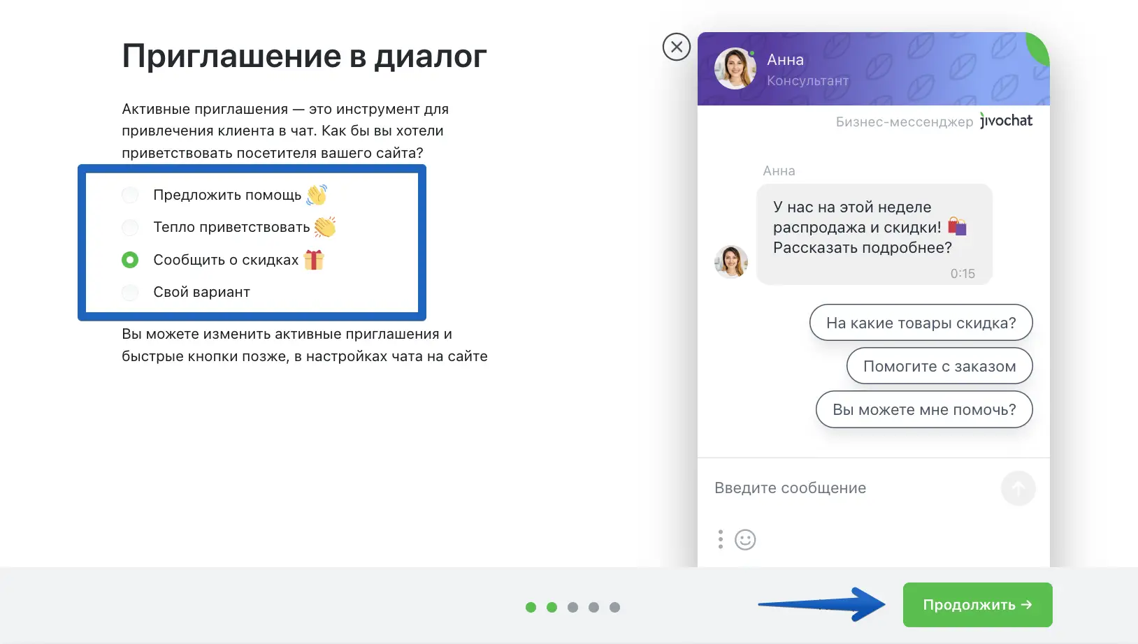 Далее выберите текст приветствия. Позднее вы сможете его отредактировать.
