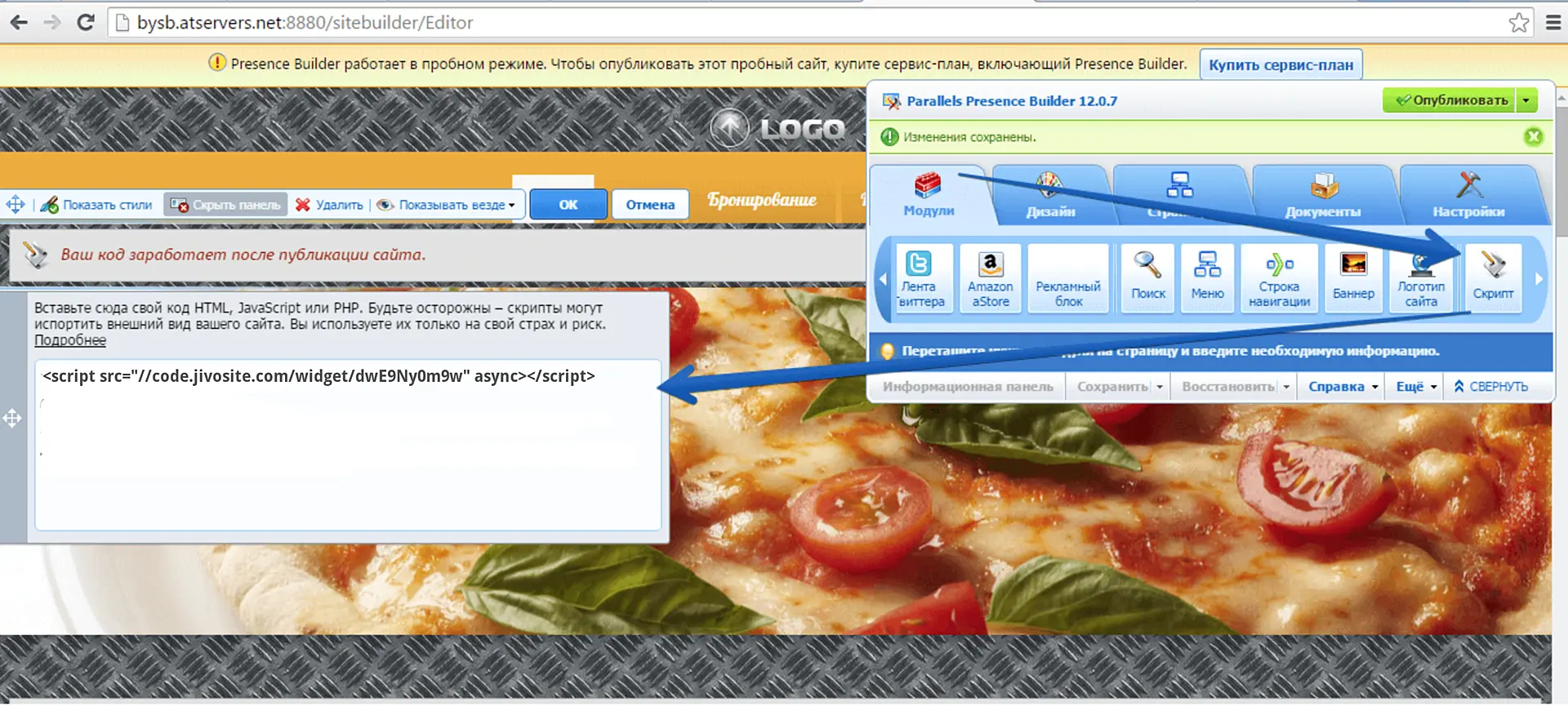 Parallels Presence Builder (Plesk) - установка кода чата