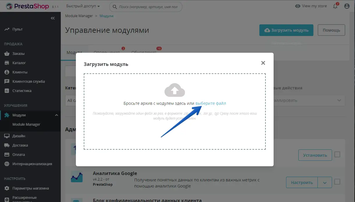 После загрузки модуля зайдите в панель управления PrestaShop и перейдите в меню "Модули" > "Менеджер модулей" ("Module Manager").