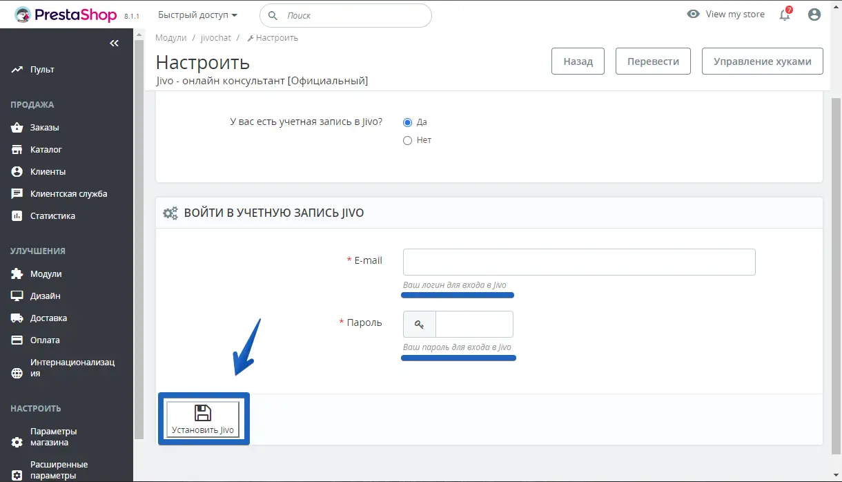 Установить код виджета Jivo на сайт под управлением CMS PrestaShop можно двумя способами: при помощи модуля и напрямую, в код.
