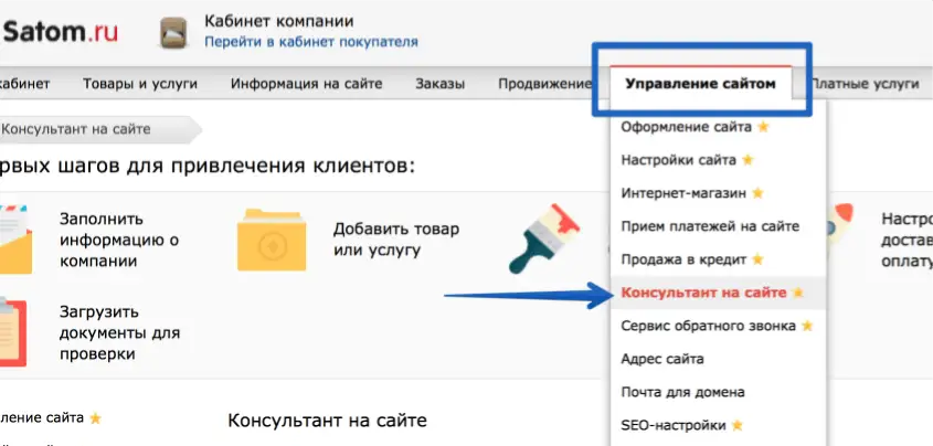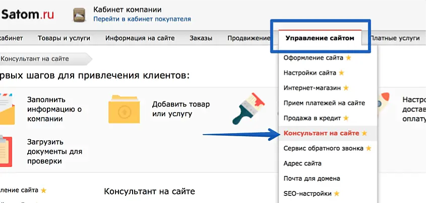 Перейдите в ваш Кабинет компании на satom.ru, zakupka.com, tomas.by или tomas.kz - Управление сайтом - Консультант на сайте: