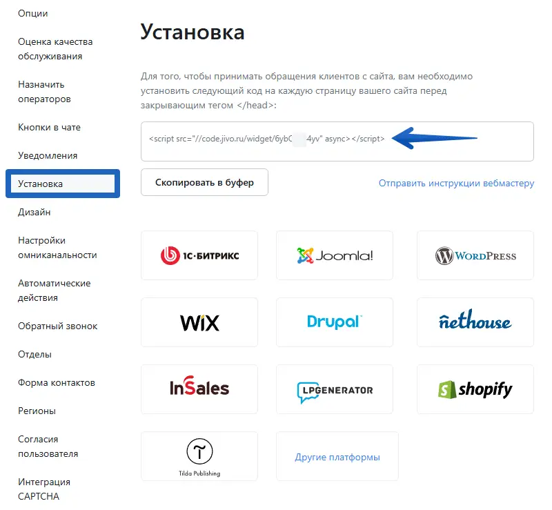 В вашем аккаунте Jivo перейдите в раздел "Управление" > "Каналы связи" > "Настроить" рядом с названием сайта.