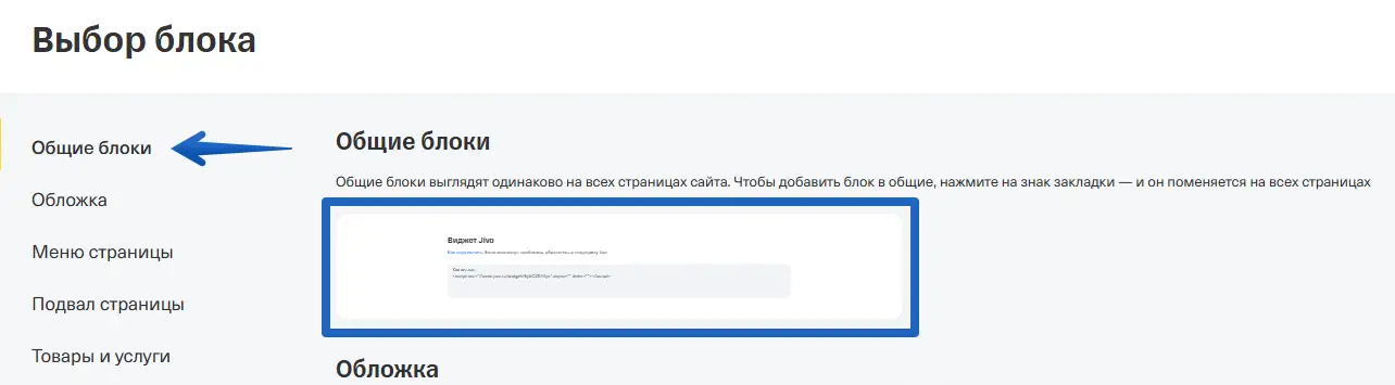 Если вы хотите, чтобы на всех страницах сайта был установлен один и тот же виджет Jivo, нажмите на иконку закладки в правом углу. Тогда этот блок добавится в список общих для сайта.