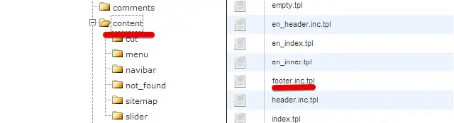 Необходимо зайти напрямую на хостинг, либо подключиться к нему через FTP-клиент и проследовать к директории: Корневая папка/templates/ваш шаблон/tpls/content.