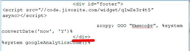 В данной директории необходимо вставить код виджета Jivo в файл «footer.inc.tpl». Код вставляете перед тегом </div>, после чего изменения нужно сохранить.