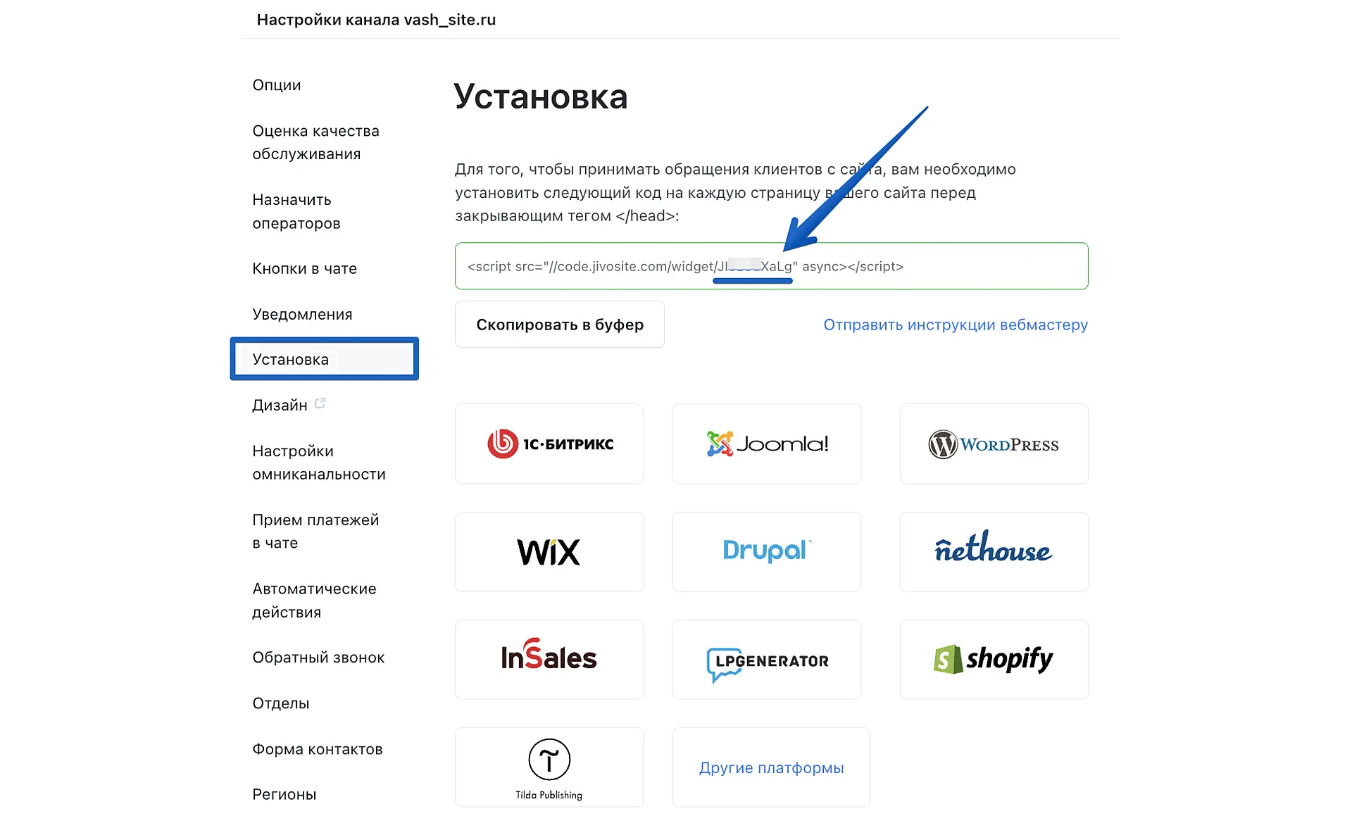 Плагин требует ID виджета, его можно скопировать из кода Jivo. Код находится в приложении Jivo в разделе Управление > Каналы связи > Настроить > Установка.