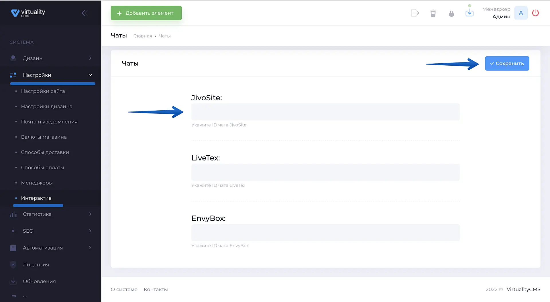 В разделе "Чаты" найдите поле "JivoSite", поместите в него скопированный на прошлом шаге ID виджета и нажмите "Сохранить".