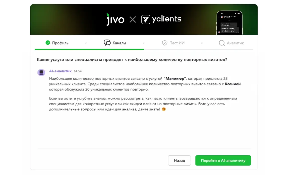 На следующей странице вы увидите рекомендацию от нашего ИИ-аналитика по наиболее популярным услугам и специалистам. Они помогут вам увеличить количество визитов.
