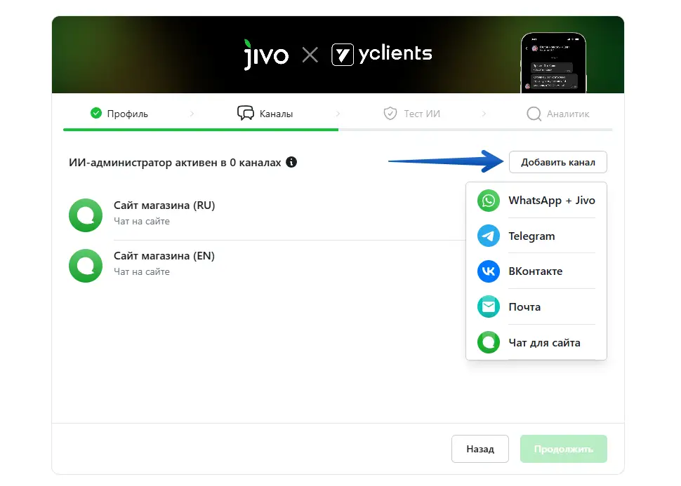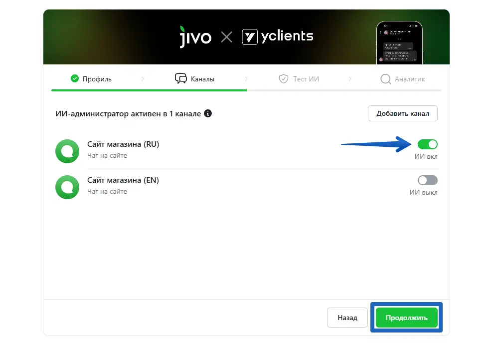 На следующем шаге добавьте каналы связи, в которых будет отвечать AI-администратор.