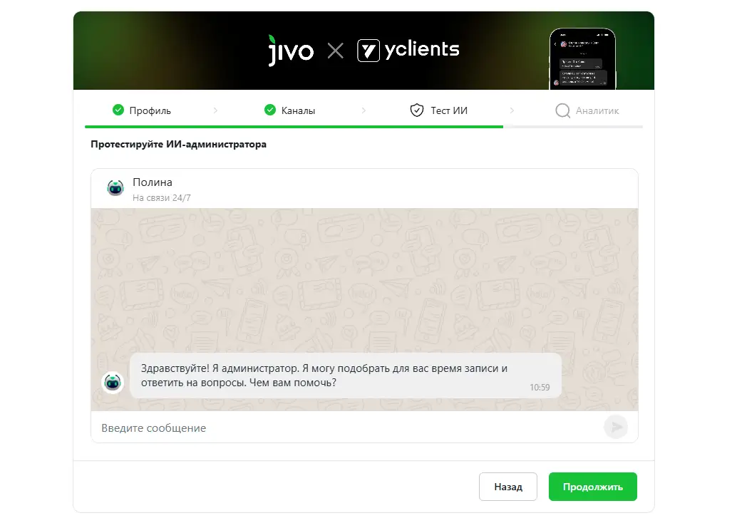 После этого автоматически откроется окно настройки ИИ-администратора. Он будет записывать ваших клиентов и отвечать на вопросы по работе филиалов.