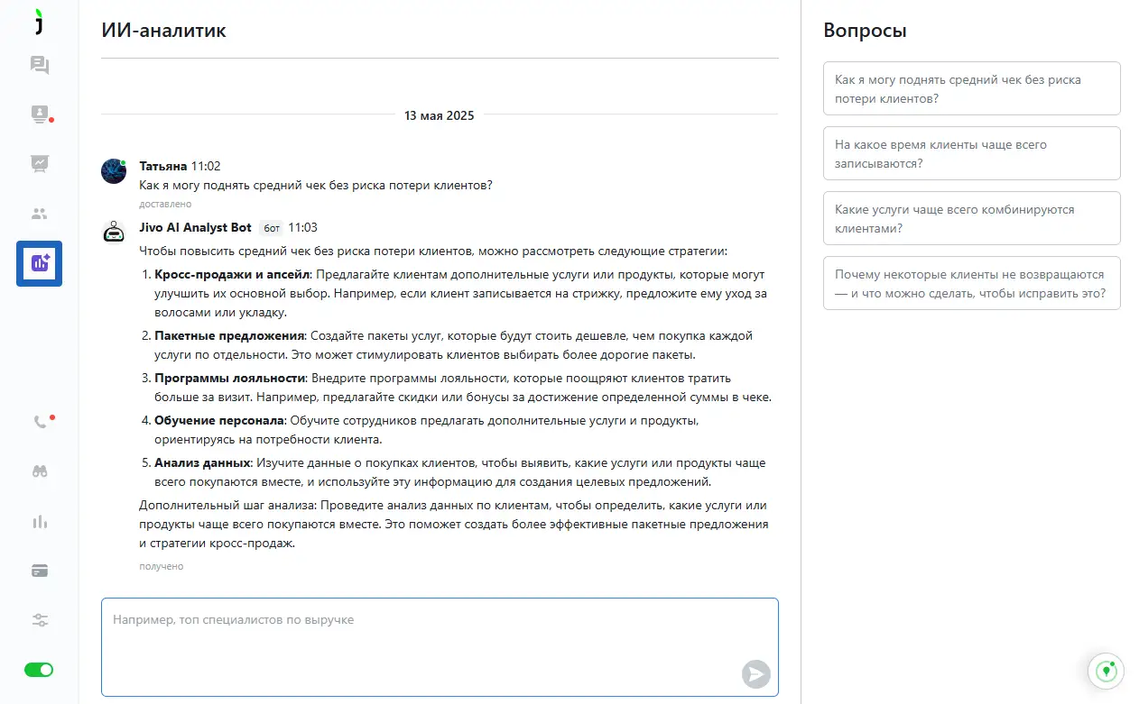 В нем вы можете уточнить у AI-аналитика, например, как скидки влияют на средний чек, какие услуги чаще всего комбинируются, на какое время чаще всего записываются клиенты и пр.