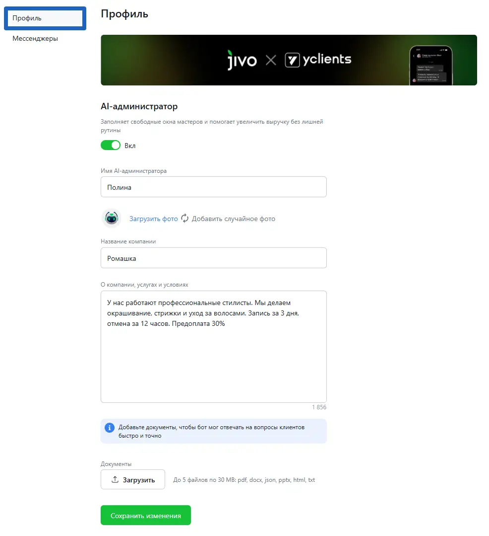 - Установить аватар, который увидят ваши клиенты при общении с ИИ-администратором.