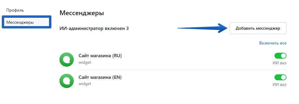 Чтобы AI-администратор общался с посетителями на добавленном канале связи, переключите тумблер "ИИ вкл".