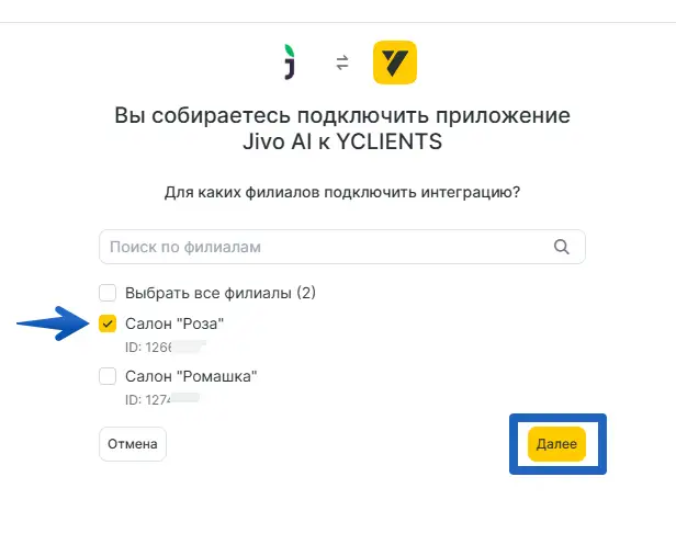 Выберите филиалы, на которые вы хотите назначить бота и нажмите "Далее".