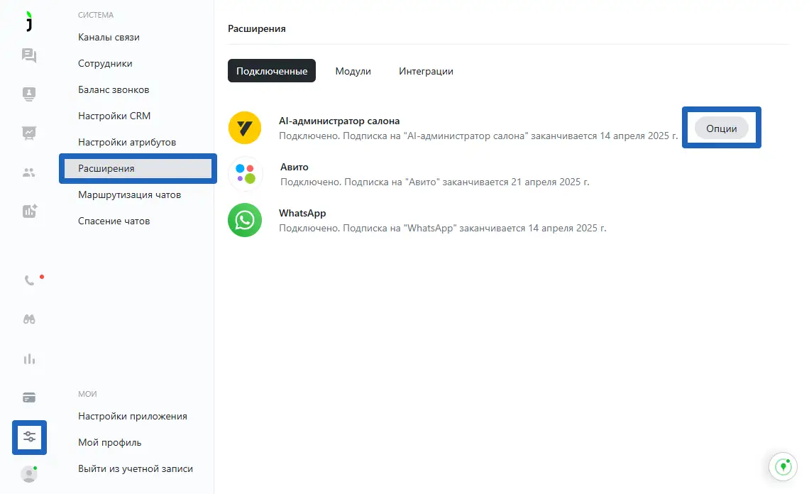 Настройки AI-администратора доступны в разделе "Управление" - "Расширения" - "Опции" справа от модуля "AI-администратор салона".