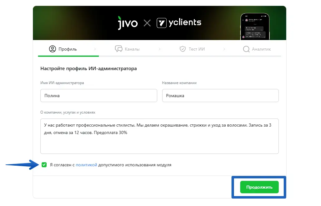 Отметьте галочкой свое согласие с политикой использования модуля и нажмите "Продолжить".