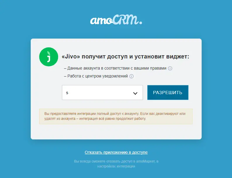 Затем выберите нужный аккаунт для подключения и разрешите доступ приложению Jivo: