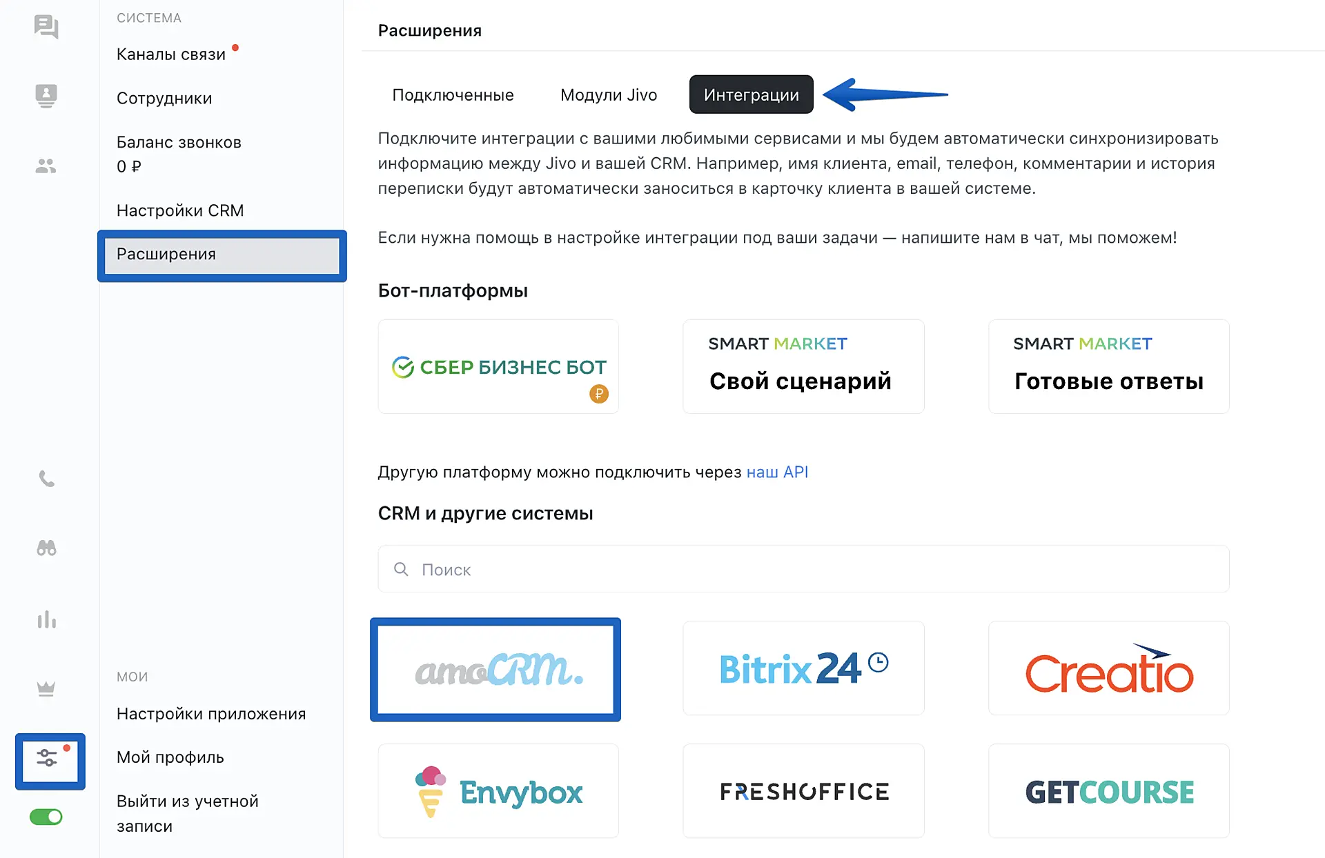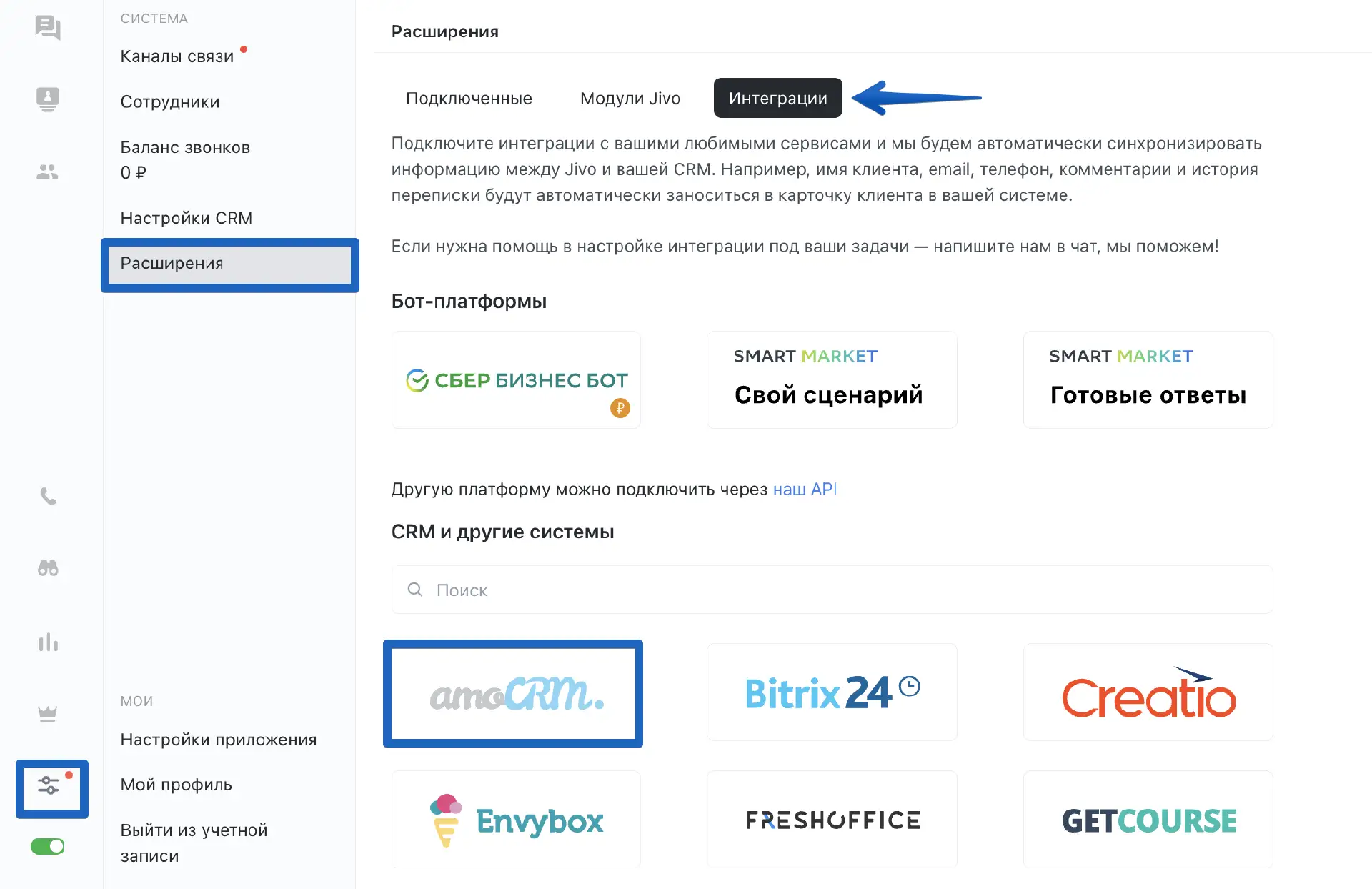 Подключить интеграцию можно прямо из приложения Jivo. Для этого зайдите в раздел "Управление" > "Расширения" > "Интеграции" и выберите "amoCRM".