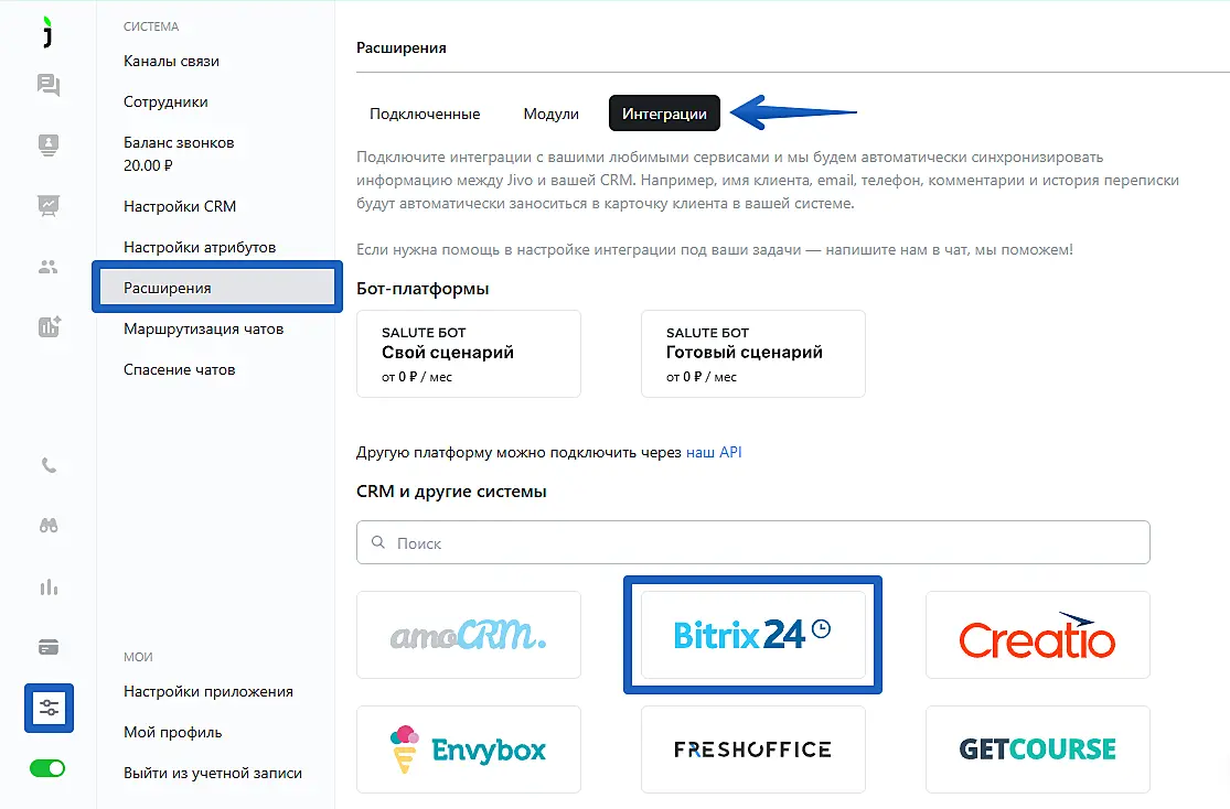 2. Откройте приложение Jivo > "Управление" > "Расширения" > "Интеграции" и выберите "Bitrix24" в разделе "CRM и другие системы".