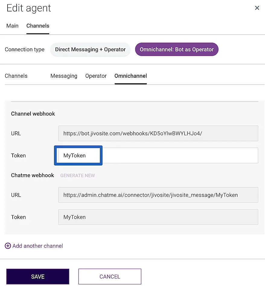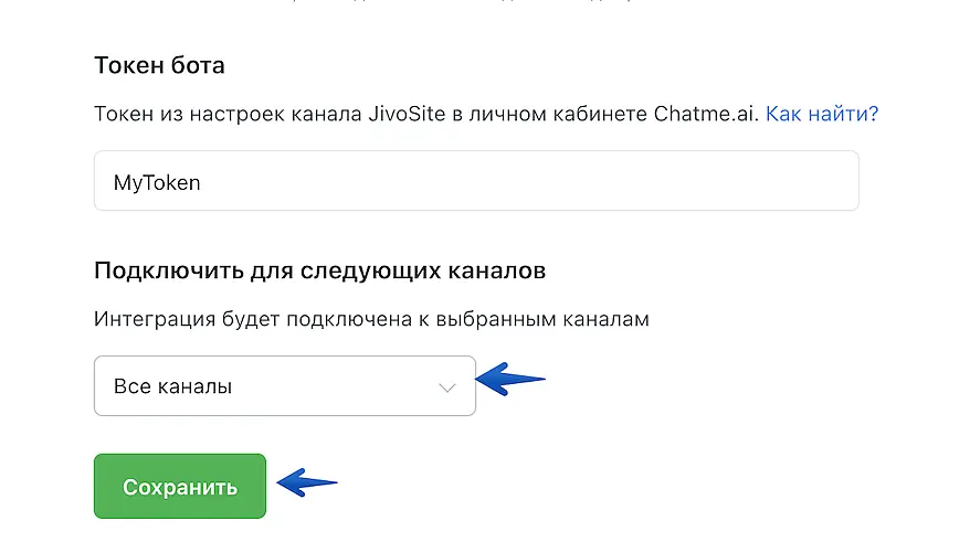 Далее укажите токен бота из ЛК Chatme.ai и выберите на каких каналах связи будет подключен бот: