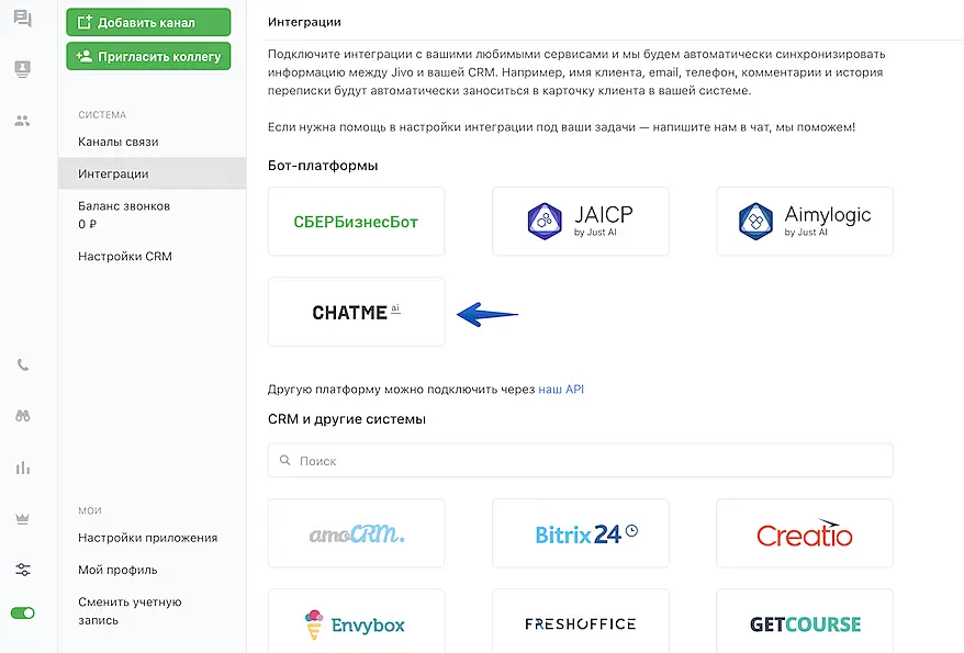 Теперь необходимо добавить интеграцию в Jivo. Для этого вам необходимо будет зайти в приложение Jivo в раздел Интеграции и выберите Chatme.ai для подключения: