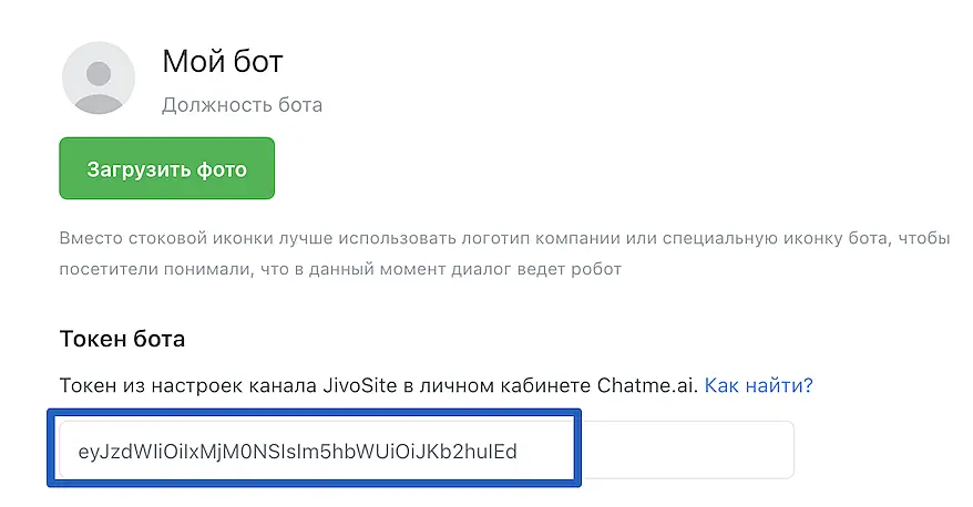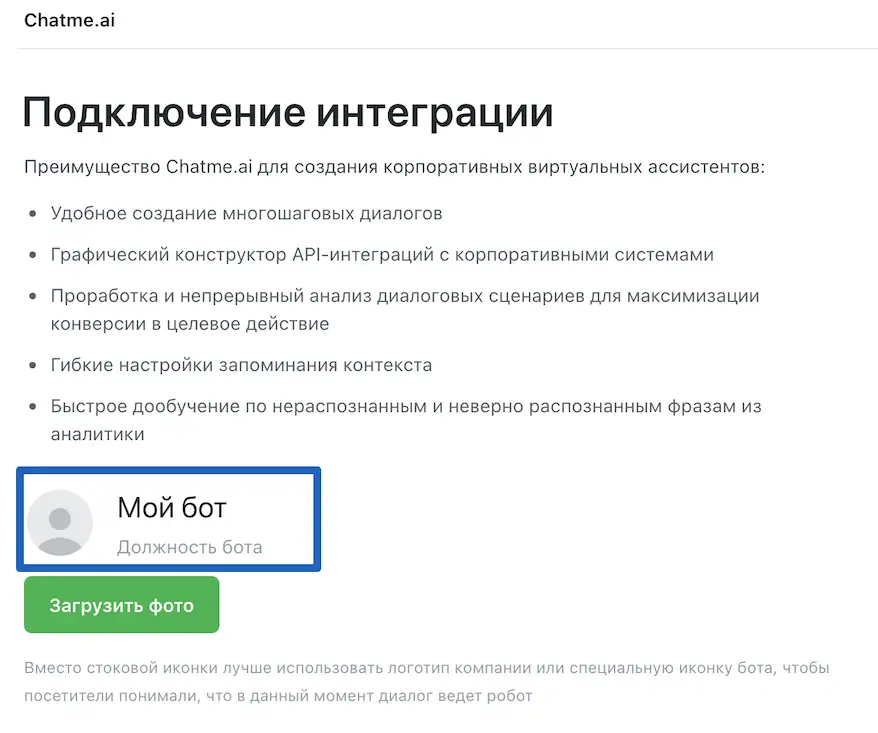 Затем, настройте внешний вид бота, который будут видеть посетители, загрузив его аватарку и указав имя и должность: