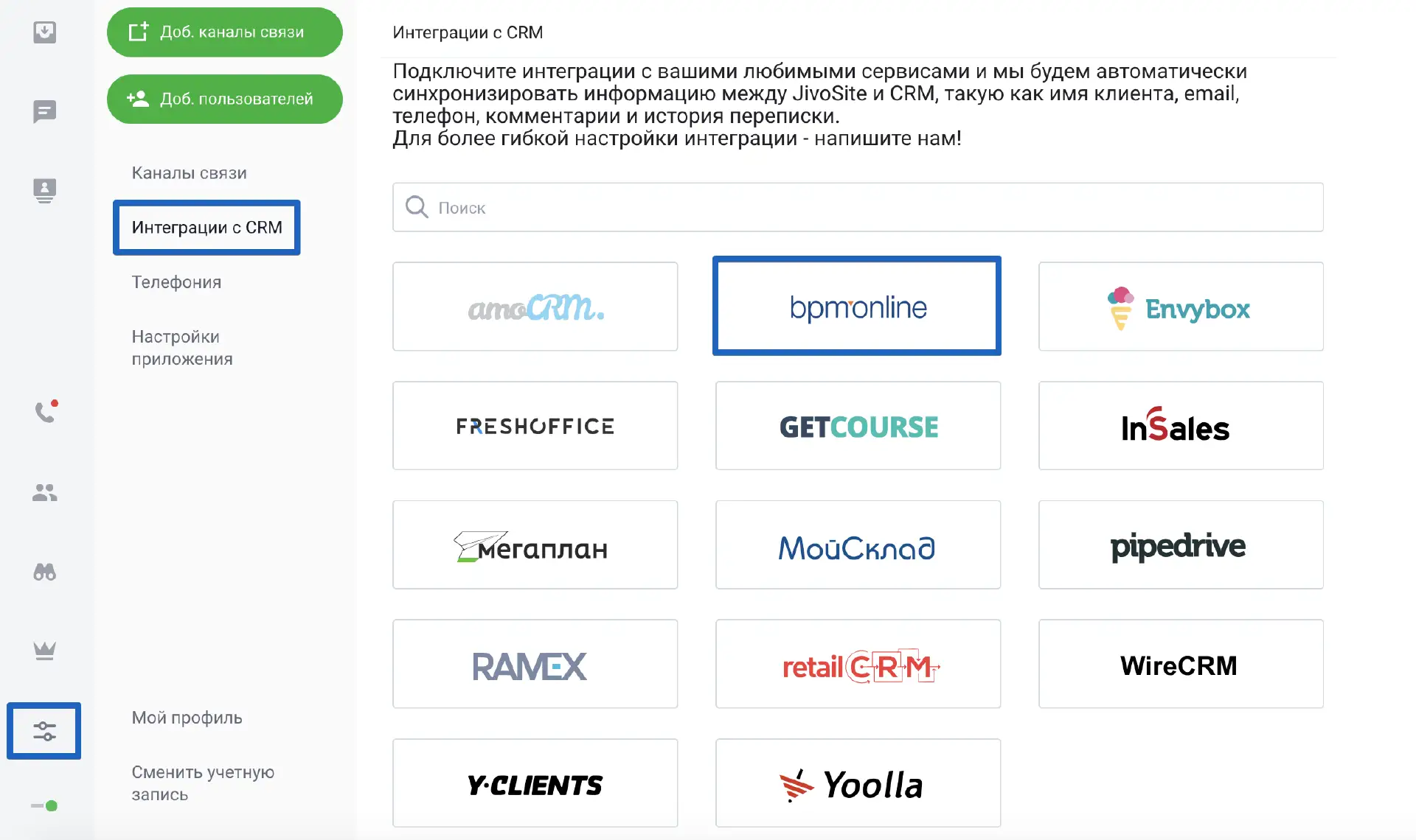 Интеграция будет подключена и вы будете получать данные из Jivo в вашу CRM. После подключения интеграция появится в списке в разделе подключенных интеграций, где можно будет менять её настройки и просматривать журнал запросов.