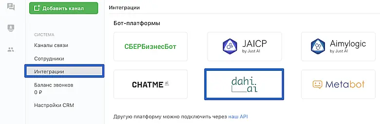 Интеграция с Dahi.ai позволяет подключить бота в диалоги с клиентами в любых каналах связи. При этом, все новые диалоги сперва будут отправляться боту и если он не сможет ответить, то будет подключен оператор.