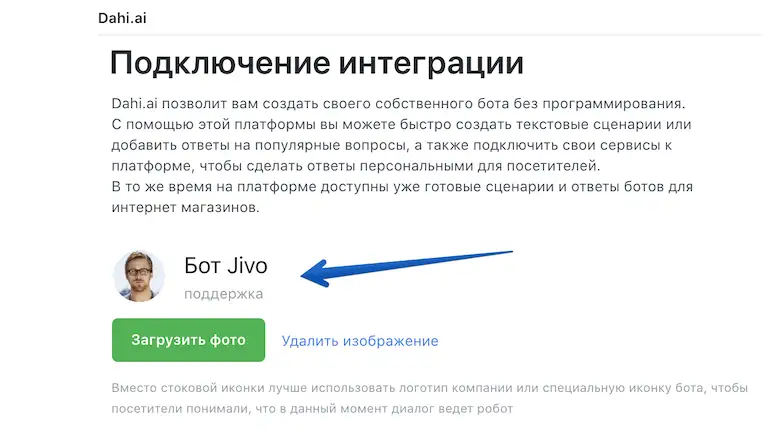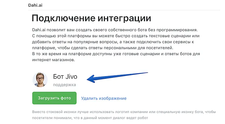Затем, настройте внешний вид бота, то как его будут видеть посетители, загрузив его аватарку и указав имя и должность: