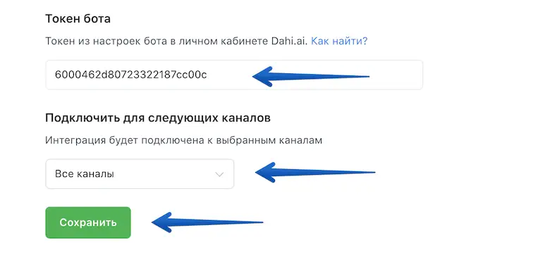 Далее укажите токен бота, который вы скопировали в панели Dahi.ai и выберите, на каких каналах связи будет подключен бот: