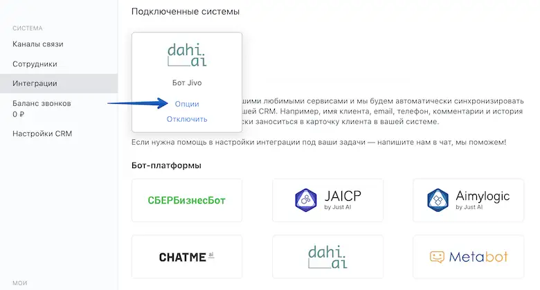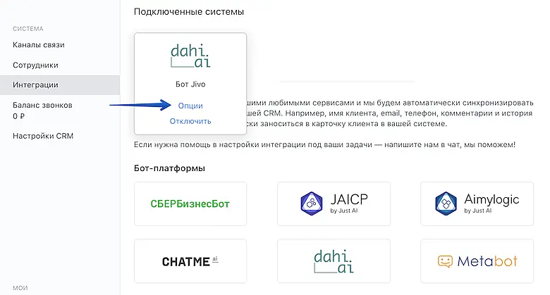 После этого авторизуйтесь в приложении Jivo и перейдите в ‘Управление‘ > ‘Интеграции‘ или воспользуйтесь ссылкой. В разделе Бот-платформы выберите Dahi.ai.