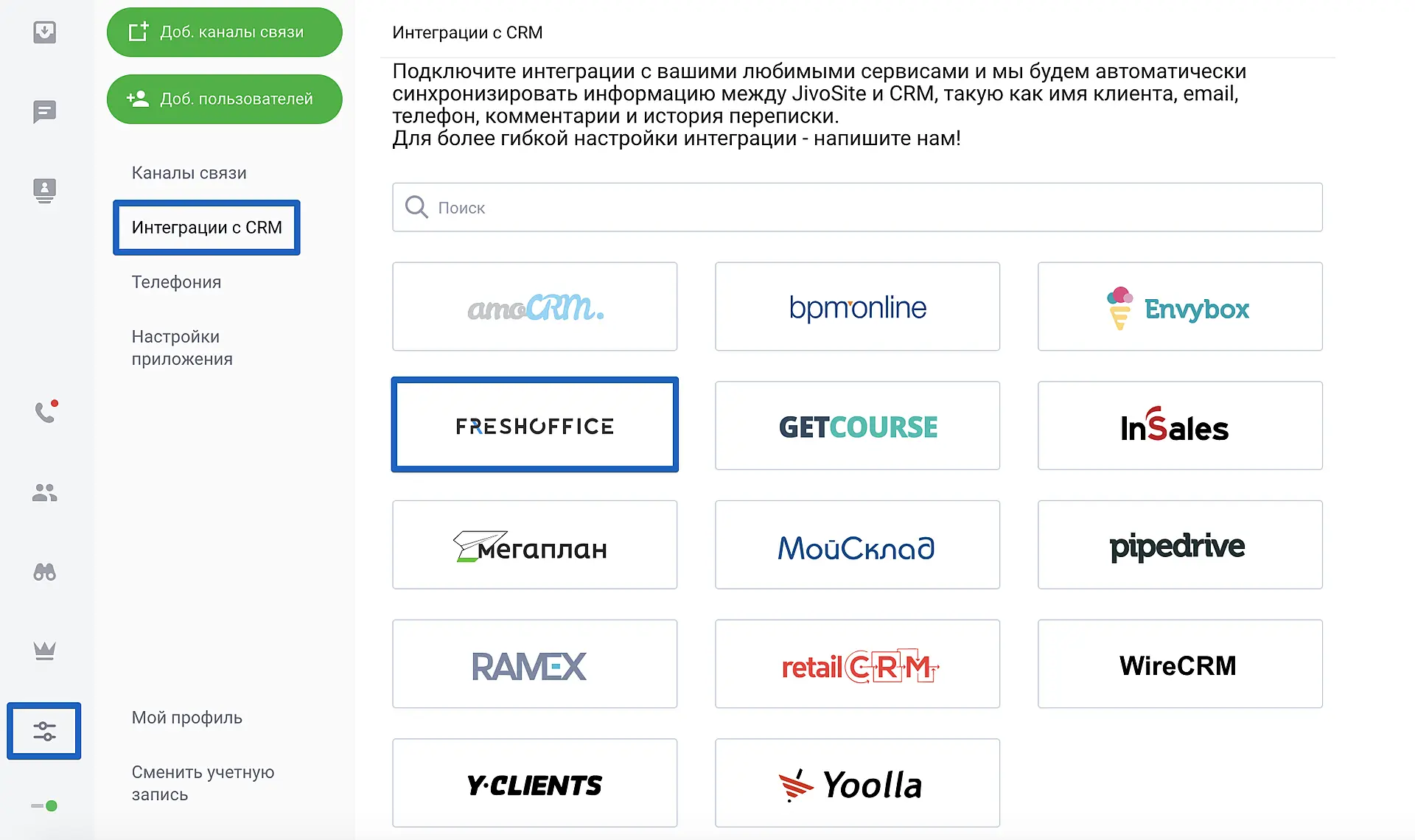 Чтобы подключить интеграцию, зайдите в наше приложение > "Управление" > "Интеграции CRM" и выберите там CRM FreshOffice.