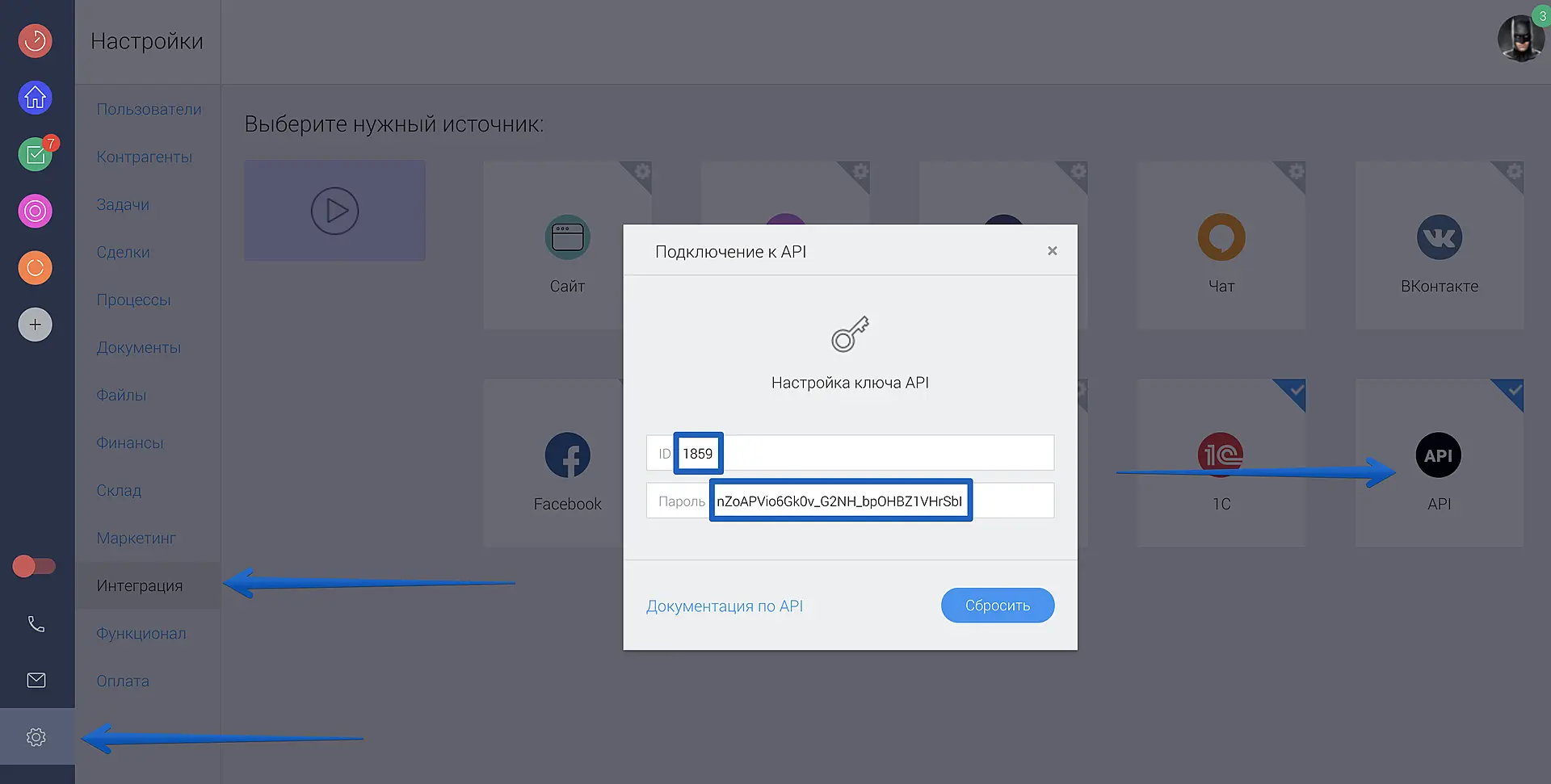 "1. API ID". Чтобы получить API ID для интеграции, в вашей системе FreshOffice зайдите в "Настройки" > "Интеграция" > "API", нажмите на кнопку "Получить ключ API".